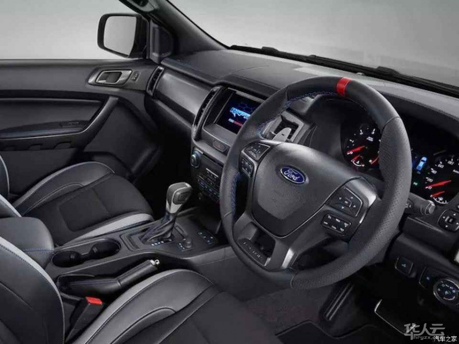 内饰方面,新车基本沿用了普通版全新Ranger的布局,中控台层次比较分明,配备有中控屏幕,下方整齐的排列有功能按键,主要的区别在于Ranger猛禽配备了全新的运动座椅,同时拥有“Raptor”标识来表明身份。