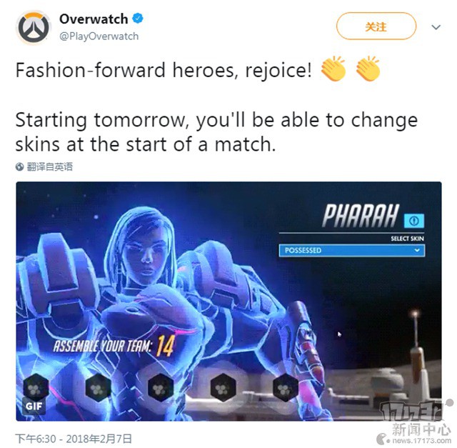 《守望先锋》史诗更新 玩家明天起可在选人界面更换皮肤