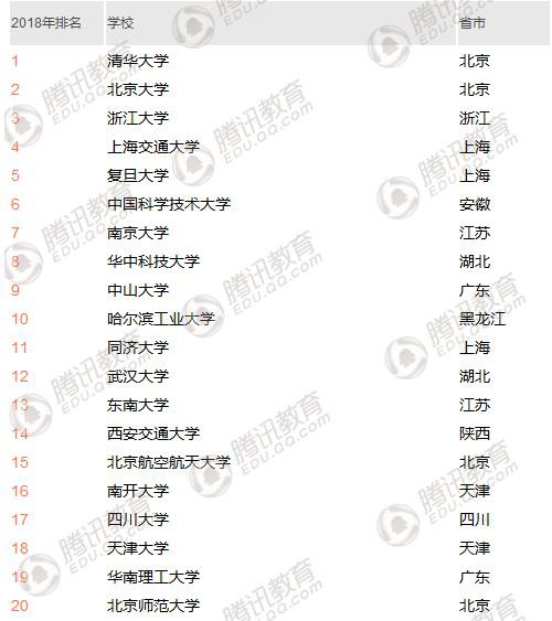 2月26日,软科发布2018“中国最好大学排名”,清华大学、北京大学、浙江大学位列前三,上海交通大学、复旦大学、中国科学技术大学、南京大学、华中科技大学、中山大学、哈尔滨工业大学依次排在四到十位。