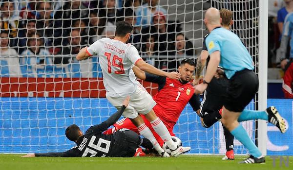 在马德里万达大都会球场内,在梅西因伤未上场的情况下,阿根廷队在友谊赛中1比6惨败西班牙队。