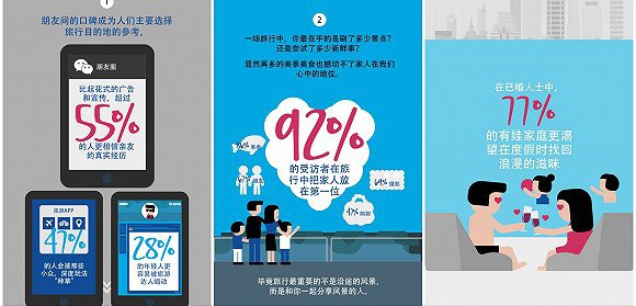蓝皮书体现的信息中很有趣的一点在于,虽然当今中国处在一个人人有手机、走到哪里必发社交媒体、吃饭动筷前必须拍照“验毒”、APP搞定身边事的智能手机+社交媒体时代,中国人的旅行习惯相对并没有那么依赖于自己的掌上设备,而是相对老派,选择更看得见摸得着的人。所以即便直接打开旅行攻略和社交媒体的手机APP都能找到达人们提供的各类旅游资讯,但这对中国人出游选择的影响力不足30%,超过一半的人还是习惯通过与亲朋好友面聊或看他们的社交媒体页面获取更加可信的旅行参考。