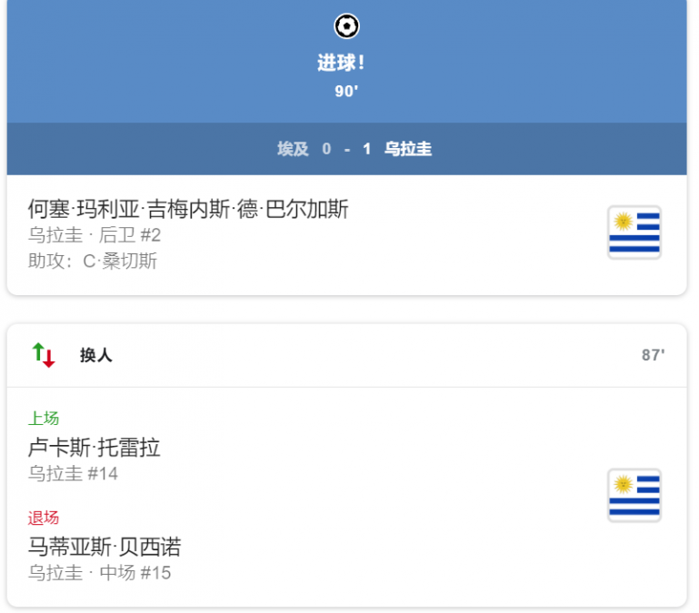 [世界杯专题]乌拉圭1:0埃及(赛程回顾) julie • 2018-06-15 00:58• 收藏本文 阿根廷时间6月15日 上午 9:01 开球 中场休息 乌拉圭0:0 埃及 90+7‘ 比赛结束 赛前回顾 转载本网稿件,原则上需要书面授权,不得篡改稿件主题。本网随时有权要求第三方停止侵权行为。 本网所载内容或图片,若涉及侵权,请联系删除。 15 ___________ 2018/06 [世界杯专题]乌拉圭1:0埃及(赛程回顾) 阿根廷时间6月15日 上午 9:01 开球中场休息 乌拉圭0:0 埃及90+7‘ 比赛结束赛前回顾 [ 微信长按识别二维码或扫码查看分享内容 ]