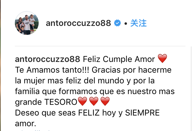 安东内拉写道“生日快乐,我的爱。我们非常爱你。谢谢你让我成为世界上最幸福的女人,也感谢你让我拥有了现在这个家,那是我们最宝贵的财富。我希望你今天能够开心,永远爱你。