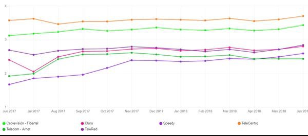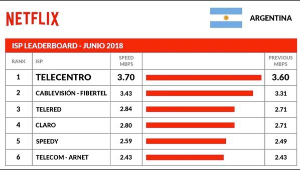 今年六月份,Telecentro公司重新回到了排名第一的位置,网络均速维持在3,70Mbps/每秒3,70兆比特(数据传输速率反映了终端设备之间的信息处理能力,它是一段时间的平均值,数值越大,说明速度越快),Cablevision - Fibertel则以3,43Mbps/每秒3,70兆比特的均速排名第二。