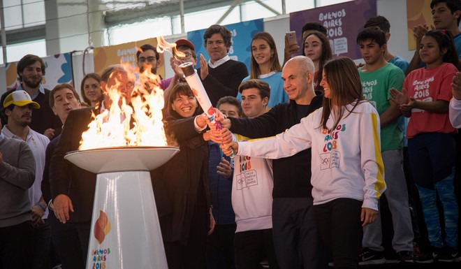 在布宜诺斯艾利斯水上公园举行的圣火点燃仪式上,本届青奥会组委会主席赫拉尔多·韦特因与运动员代表、阿根廷拳击选手维多利亚·萨普托共同点燃了圣火。