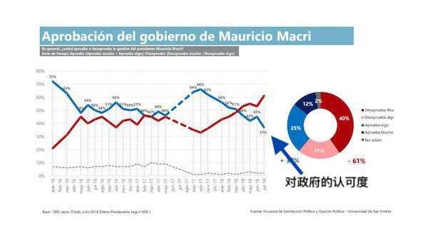 在上次选举后,马克里政府获得了社会的高度认同,当时53%的民众都对国家的总体进展表示非常满意;然而,随着时间的推移,民众认可度下降了31个百分点,目前仅为22%,这也是马克里上任以来的最低值。