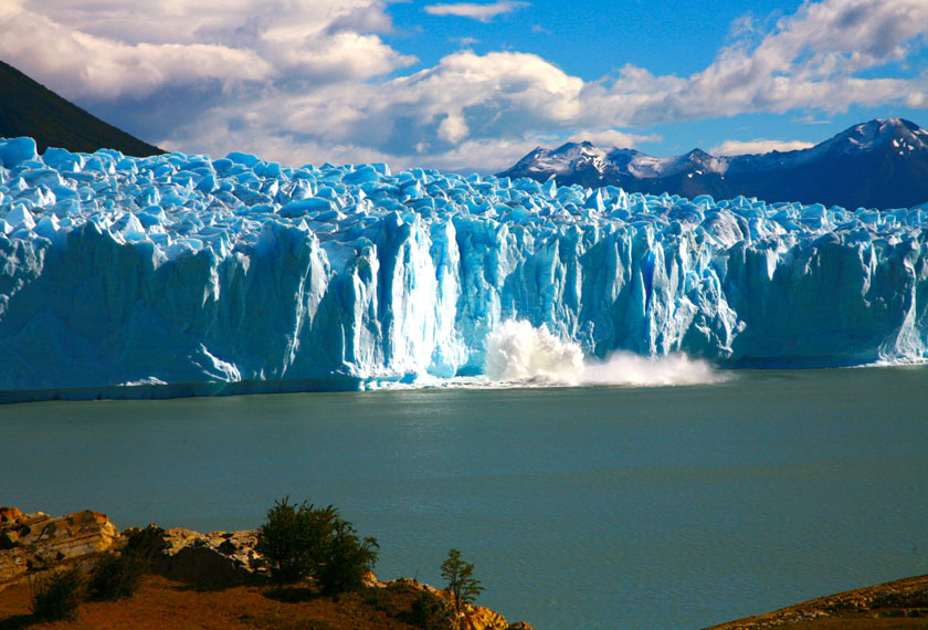 夏季气温较高,冰川加速融化时能看到像房屋一样巨大的冰块落入湖中,轰鸣阵阵。据说1833年,达尔文乘坐英国军舰“小猎犬”号路过此地,莫雷诺冰川断裂发出的巨大响声,被他形容为“军舰通过航道时的万炮齐鸣”。