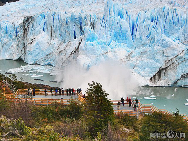 大冰川国家公园由47个大小冰川组成,其中最著名的是莫雷诺大冰川(PERITO MORENO),面积达 257平方公里,是世界三大冰川之一,也是少数还在继续生长的冰川之一,景色极为壮观。站在专门修建的观赏平台上,游客可以看到冰川是怎样从雪山顶上“倾泻”而下的。冰川正面笔直如削,顶部有无数裂隙,经过阳光的透射、折射,呈现出缤纷的颜色。在观景台上,不时可听到从冰川上传来冰川崩裂的低沉的隆隆声。