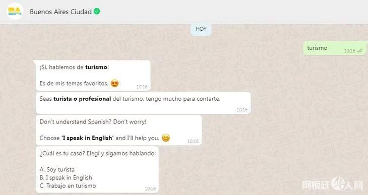 读者朋友们可以向布市官方WhatsApp(1150500147)发送“Turismo(旅游)”一词,即会出现【A. Soy turista(我是游客)】【B. I speak in English(我讲英文)】以及【C. Trabajo en turismo(我是旅游业从业者)】三个选项。